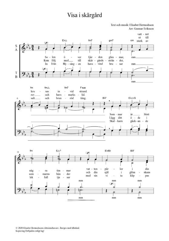 En mycket tidig visa av Elisabet Hermodsson, arrangerad för blandad kör av Gunnar Eriksson. Sången, en skärgårdsvals, hör hemma i en klassisk svensk vistradition.