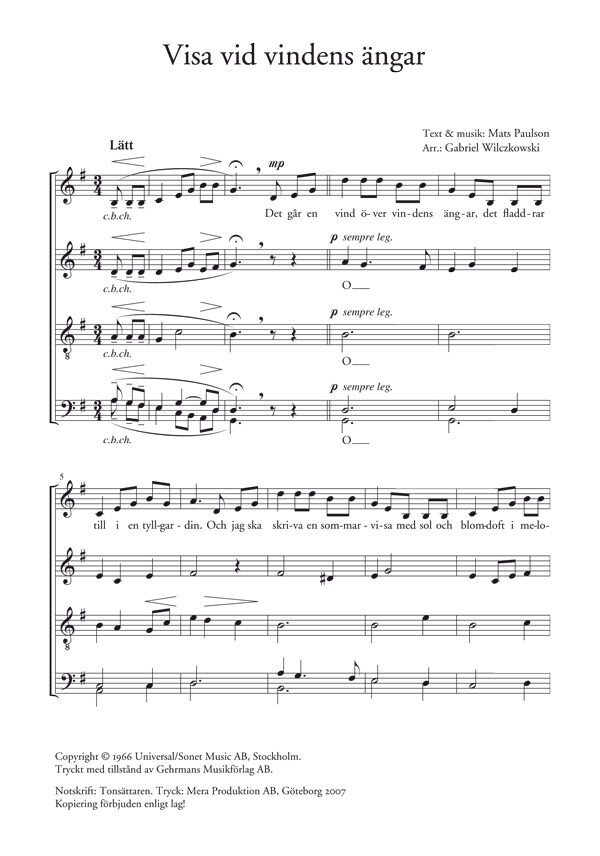 Mats Paulsons välkända visa i arrangemang för blandad kör a cappella av Gabriel Wilczkowski.