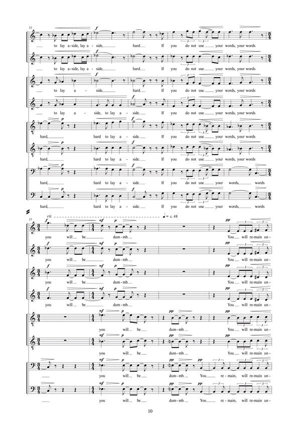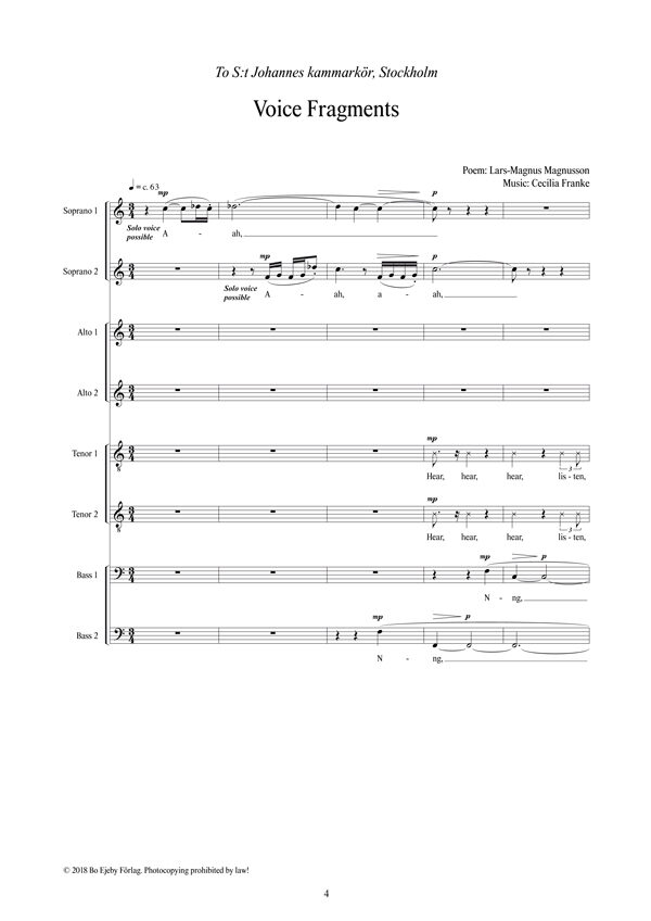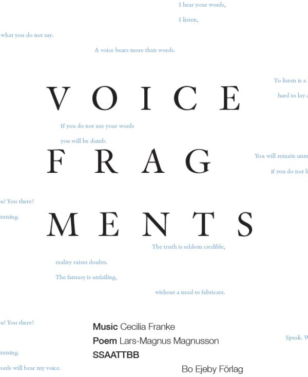Verket ges här ut med engelsk text, men komponerades ursprungligen med svensk text och uruppfördes 2015 under titeln Röstfragment.” – Cecilia Franke
