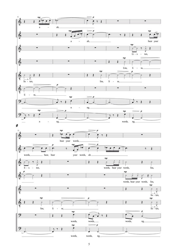 Kompositionen börjar med några ljud – a-ah, n-ng, s – fragment som också är byggklossar till ord, ljudklossar som används och återanvänds till att bära olika betydelser i olika sammanhang. Samma tillvägagångssätt gäller också i musik där enkla element bygger själva kompositionen men också kan förändra musikens innebörd.
