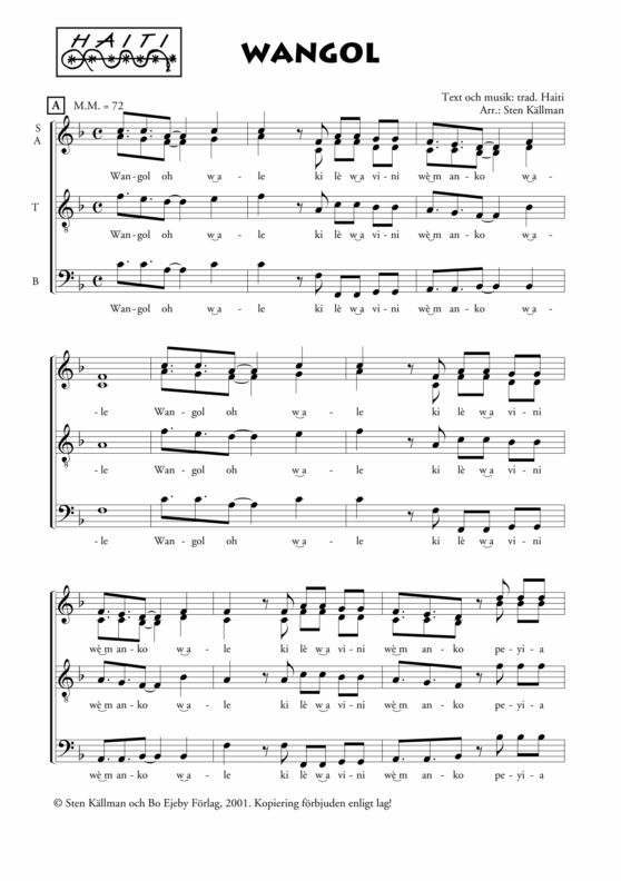 Traditionell musik från Haiti i arrangemang för kör och slagverk. En sång ur Sångensemblen Amandas repertoar. Finns också inspelad på CD:n ”Amanda” och ”Amanda chante Haiti”.