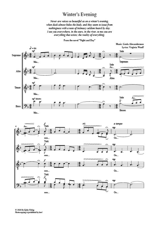 Linda Alexandersson has chosen some lines from a novel by Virginia Woolf for her composition, a nocturnal mood song for mixed choir a cappella.